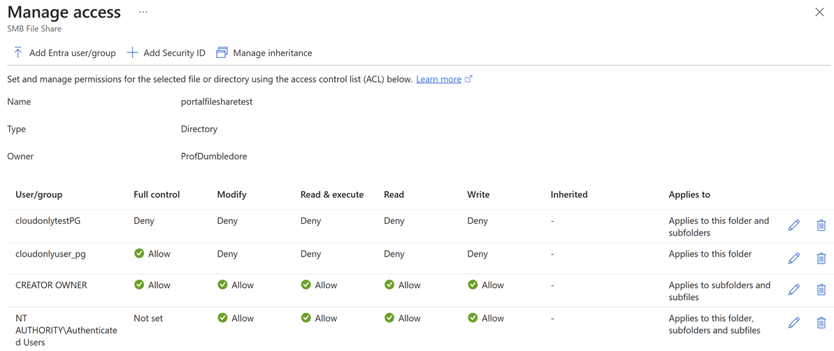 Se você tiver o Microsoft Entra Kerberos configurado como sua fonte de identidade, poderá configurar ACLs do Windows por usuário ou grupo do Entra usando o portal do Azure. Esse método funciona para identidades híbridas e somente na nuvem somente quando o Microsoft Entra Kerberos é usado como a fonte de identidade.