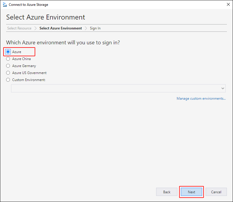 Selecione o ambiente apropriado e clique em Avançar. Você também pode selecionar Gerenciar ambientes personalizados para configurar e adicionar um ambiente personalizado.