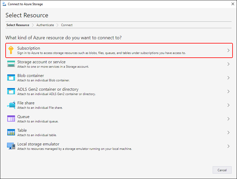 Na caixa de diálogo Conectar-se ao Armazenamento do Azure, selecione Assinatura.