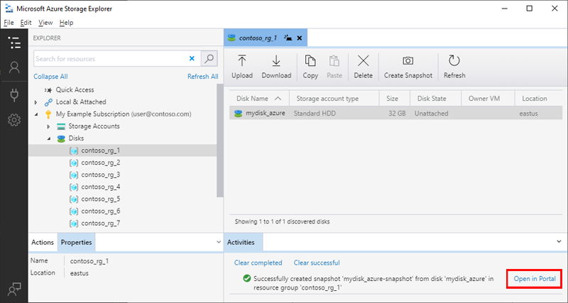 Depois que o instantâneo foi criada, você pode selecionar Abrir no Portal em Atividades para exibir o instantâneo no portal do Azure.