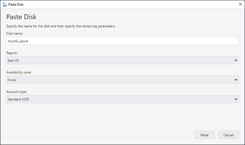 Na caixa de diálogo Colar disco, preencha os valores. Você também pode especificar uma zona de disponibilidade em regiões com suporte.