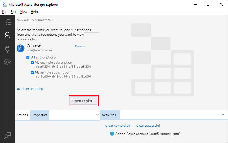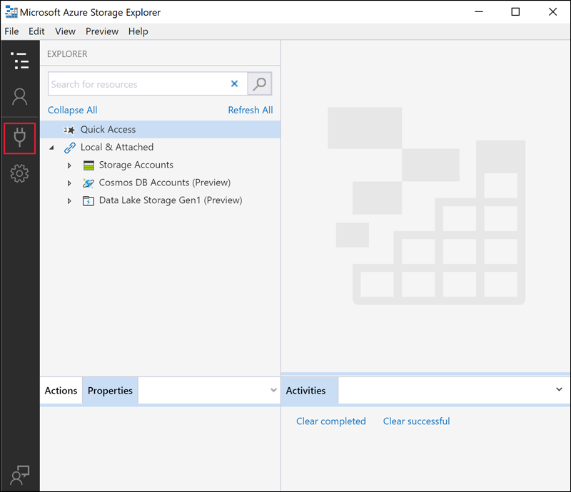 Abra o Gerenciador de Armazenamento do Azure e selecione o ícone Conexão na barra de ferramentas.