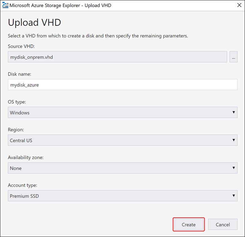 Na caixa de diálogo Carregar VHD, especifique o arquivo de origem de VHD, o nome do disco, o tipo de sistema operacional, a região para a qual você deseja carregar o disco e o tipo de conta. Se a região permitir zonas de disponibilidade, você pode selecionar uma zona de sua preferência. Selecione Criar para começar a carregar o disco.
