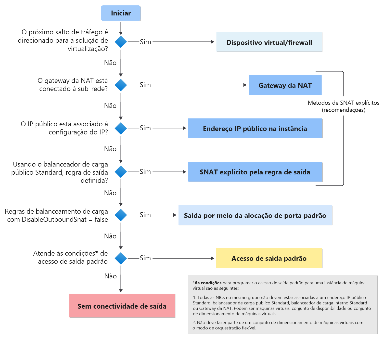 Se uma VM (Máquina Virtual) for implantada sem um método de conectividade de saída explícito, o Azure atribuirá um endereço IP público de saída padrão. Este IP, conhecido como IP de acesso padrão à saída, é de propriedade da Microsoft e pode ser alterado sem aviso prévio. Ele não é recomendado para cargas de trabalho de produção.