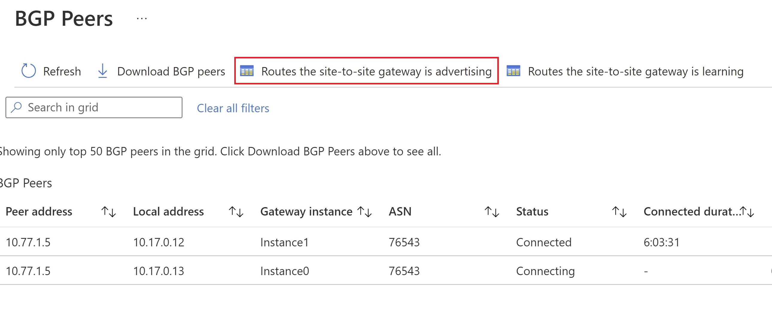 Na página Pares BGP, clique em Rotas que o gateway site a site está anunciando para mostrar a página Rotas Anunciadas.
