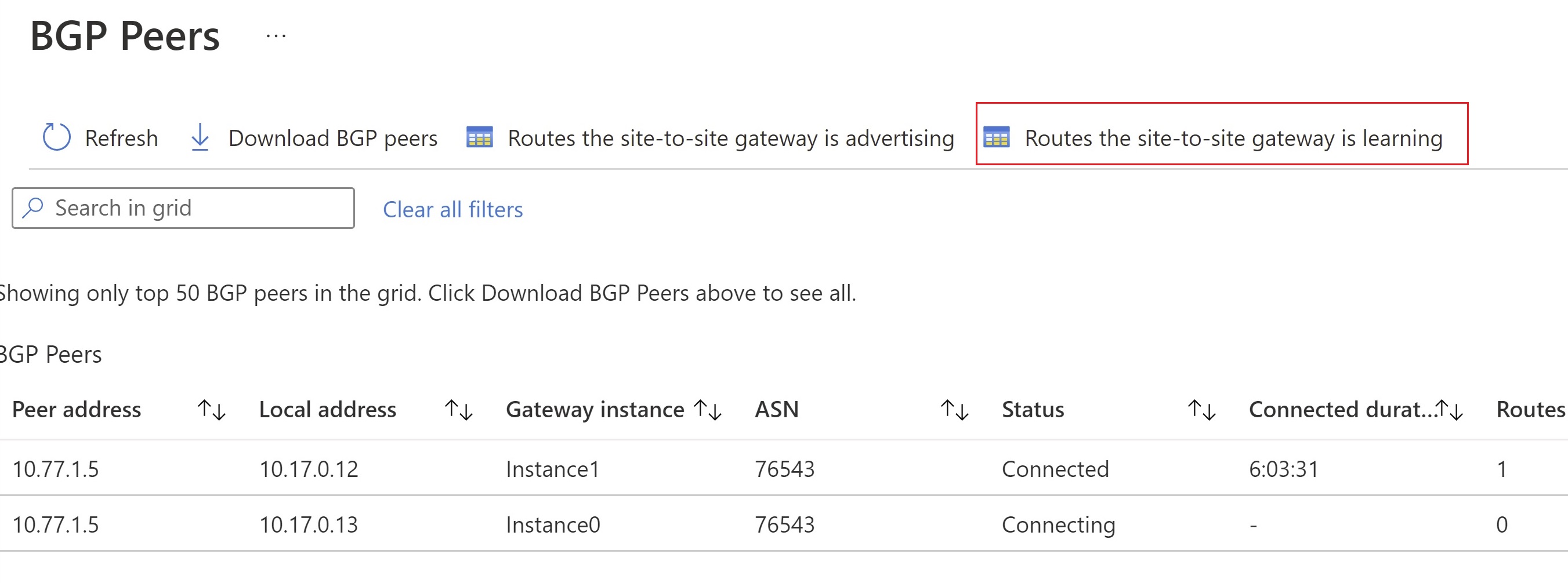 Na página Pares BGP, clique em Rotas que o gateway site a site está aprendendo para mostrar a página Rotas Aprendidas.