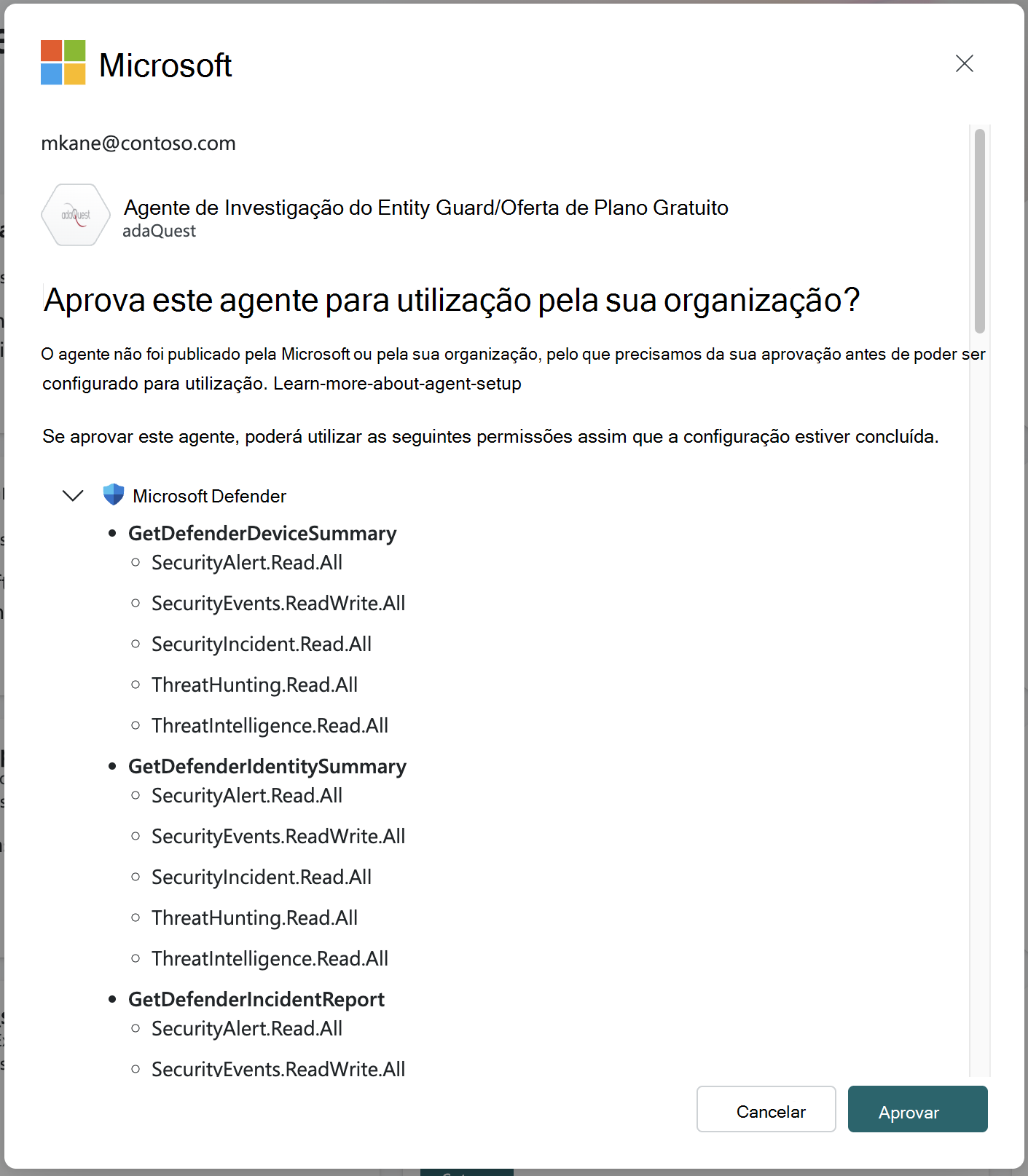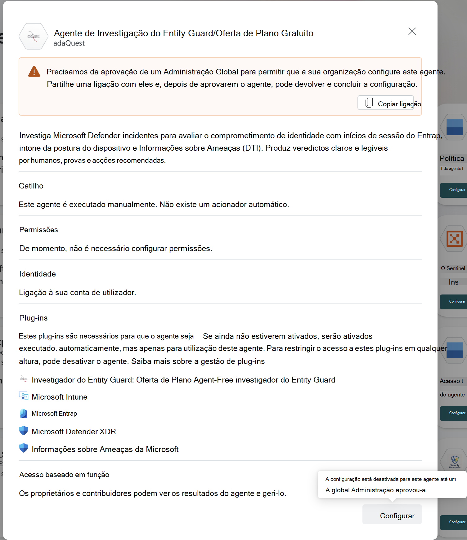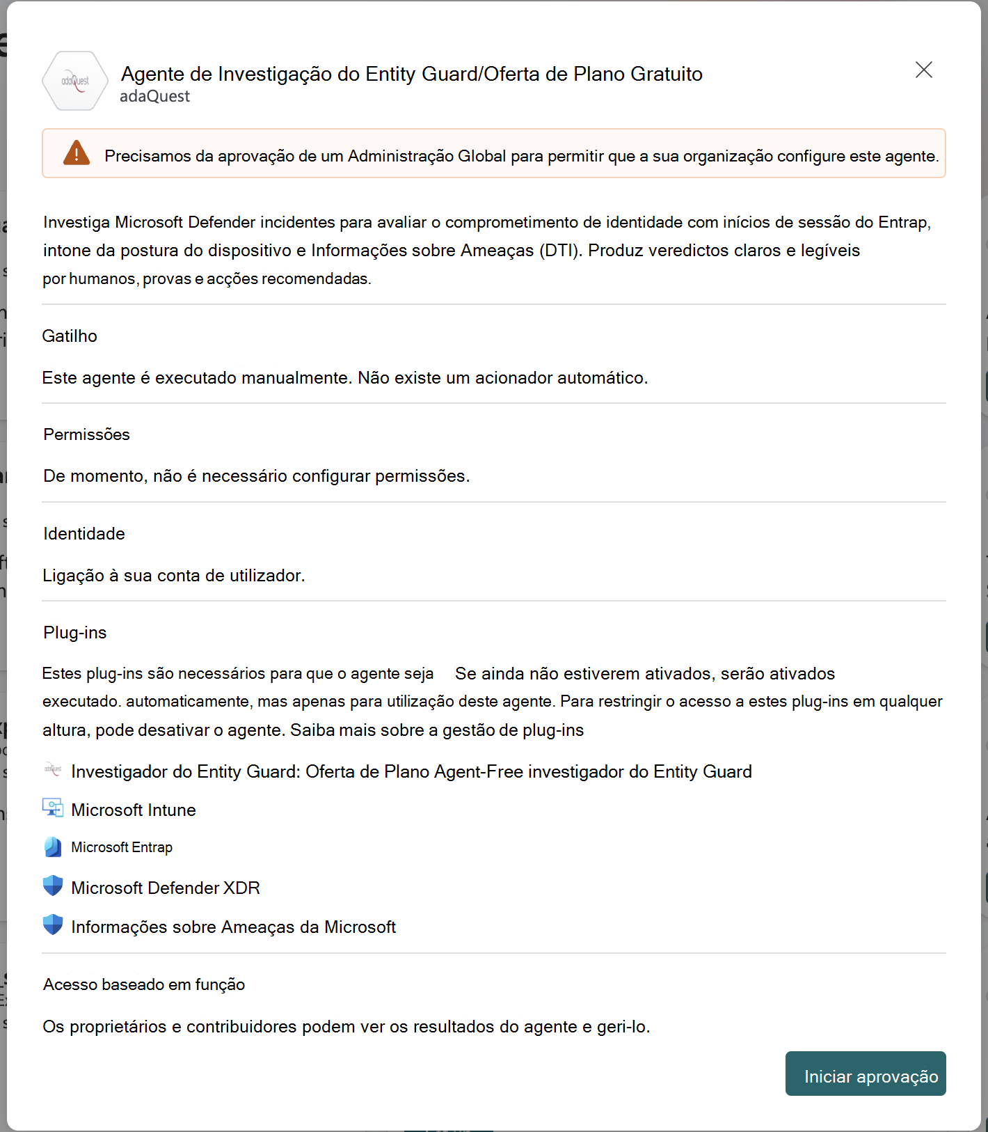 Ao configurar um agente criado por parceiros que acede a uma ferramenta (competência) da Microsoft e acede a dados de um produto Microsoft, como Microsoft Intune, Microsoft Entra, Microsoft Sentinel, Defender ou Defender Threat Intelligence, um Administrador Global no inquilino tem de aprovar para permitir o acesso às permissões necessárias para o agente.