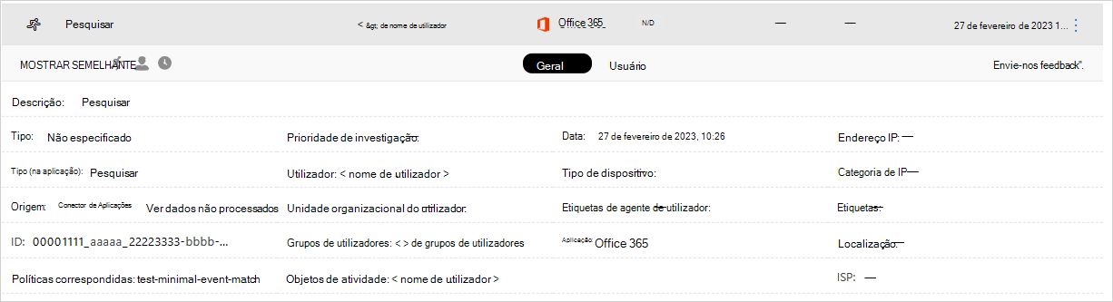 Ao selecioná-la, o separador Utilizador da gaveta atividade fornece as seguintes informações sobre o utilizador:- Alertas abertos: o número de alertas abertos que envolvem o utilizador.