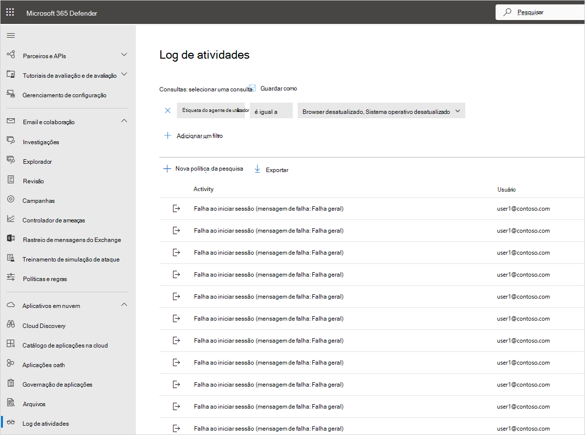 Por exemplo, pode utilizar o Registo de atividades para localizar utilizadores na sua organização que estejam a utilizar sistemas operativos ou browsers desatualizados, da seguinte forma: depois de ligar uma aplicação a Defender para Aplicativos de Nuvem na página Registo de atividades, utilize o filtro avançado e selecione Etiqueta do agente do utilizador. Em seguida, selecione Browser desatualizado ou Sistema operativo desatualizado.