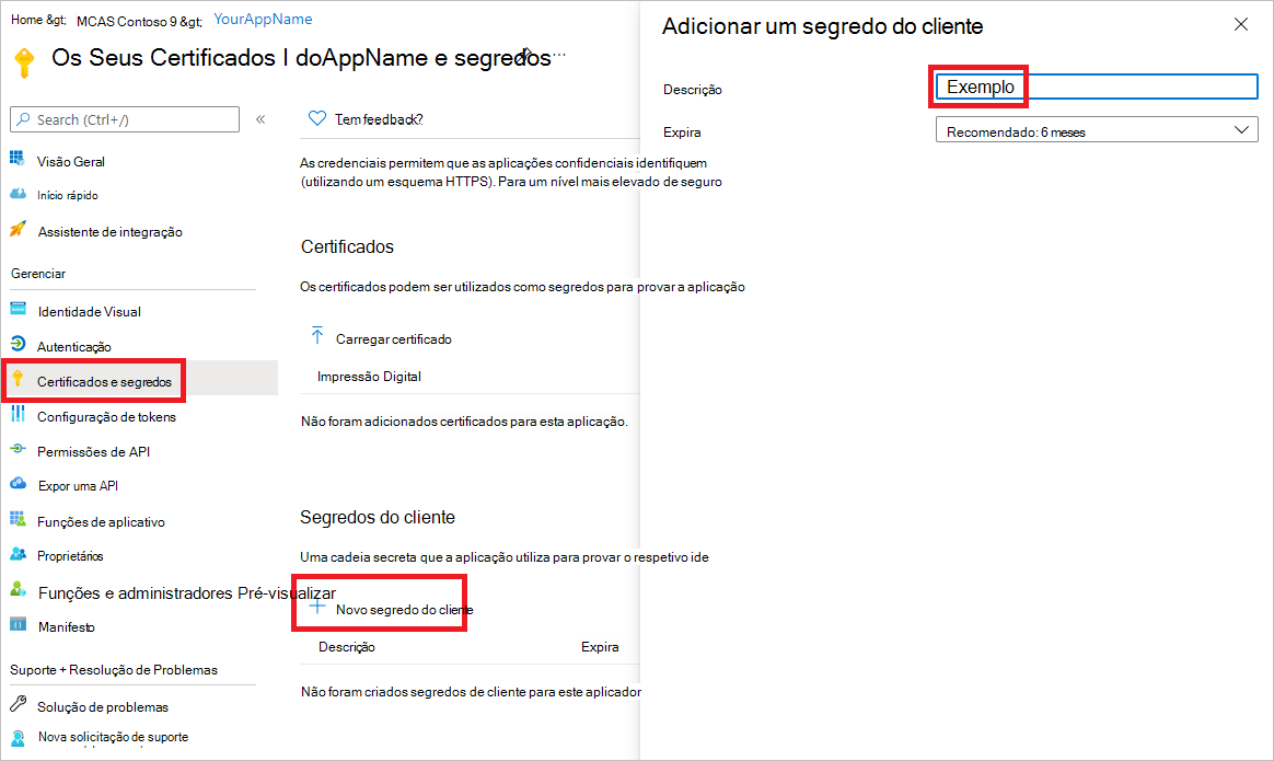 Para adicionar um segredo à aplicação, selecione Certificados & segredos, selecione Novo segredo do cliente. Adicione uma descrição ao segredo e, em seguida, selecione Adicionar.