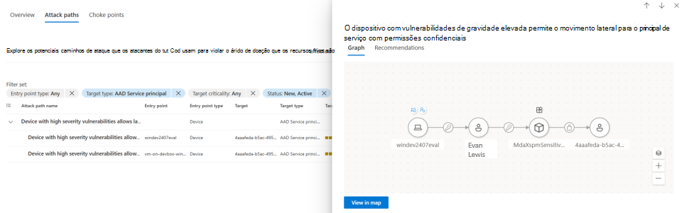 Selecione o caminho de ataque intitulado: "O dispositivo com vulnerabilidades de gravidade elevada permite o movimento lateral para o principal de serviço com permissões confidenciais"