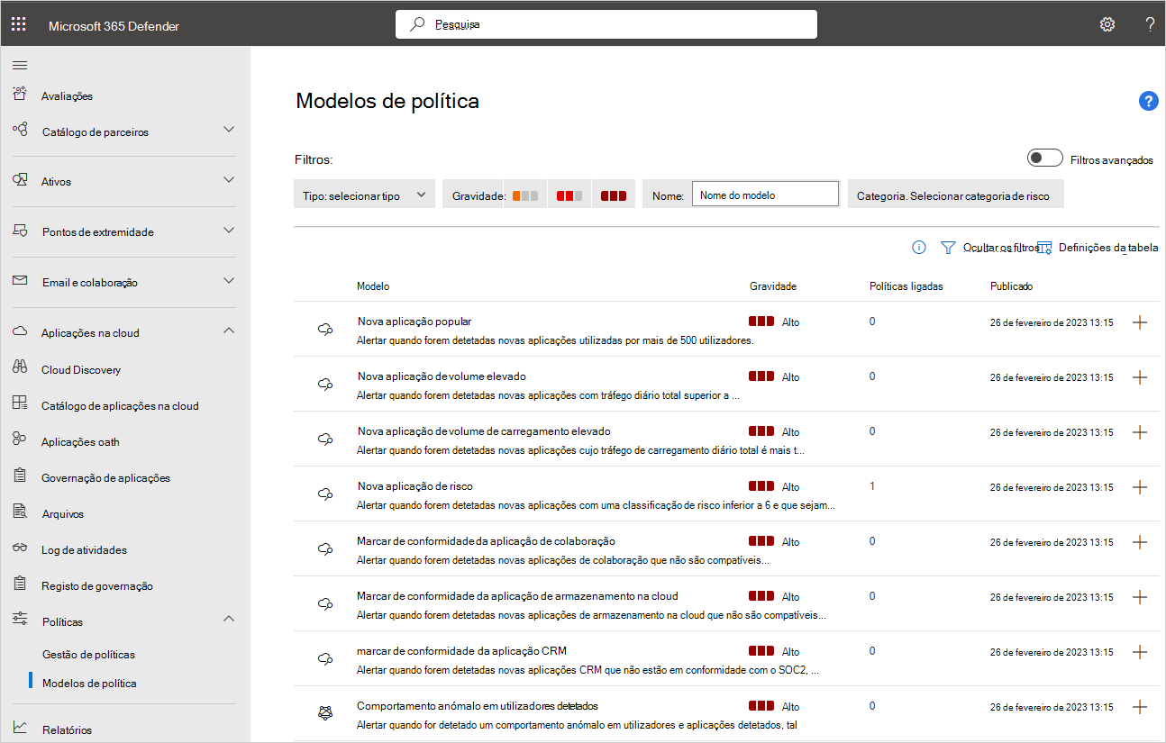 Para ver a lista completa de modelos de política, no Portal do Microsoft Defender, em Aplicações na Cloud, aceda a Políticas ->Modelos de política. Por exemplo: