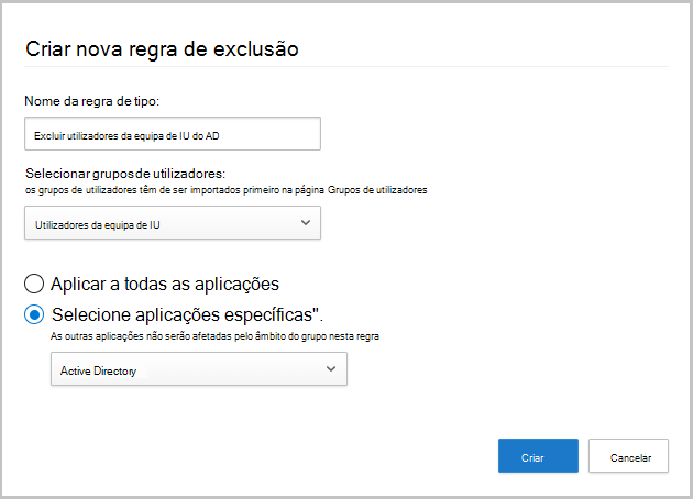 Para definir grupos específicos para serem excluídos da monitorização, no separador Excluir , selecione +Adicionar regra.