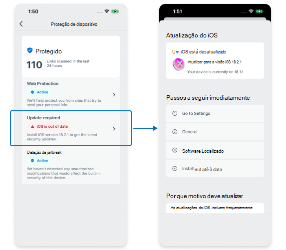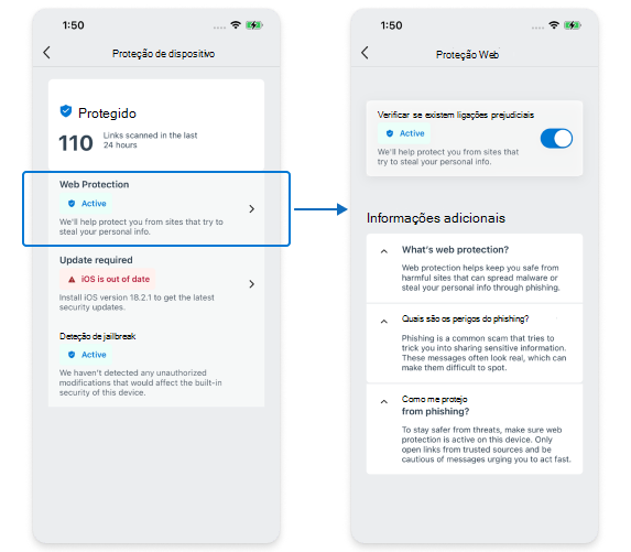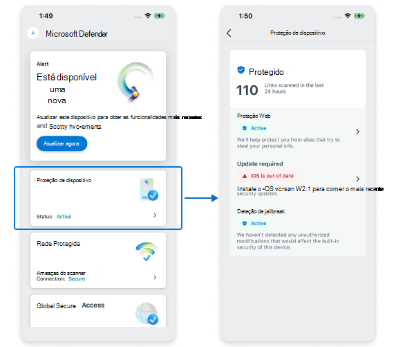 Uma funcionalidade card denominada Proteção de Dispositivos lista a Proteção da Web, o Estado de Funcionamento do Dispositivo e a Jail Break. Anteriormente, o dashboard tinha uma card para cada conjunto de capacidades. Na nova experiência, apenas a Proteção de Dispositivos card alterações.