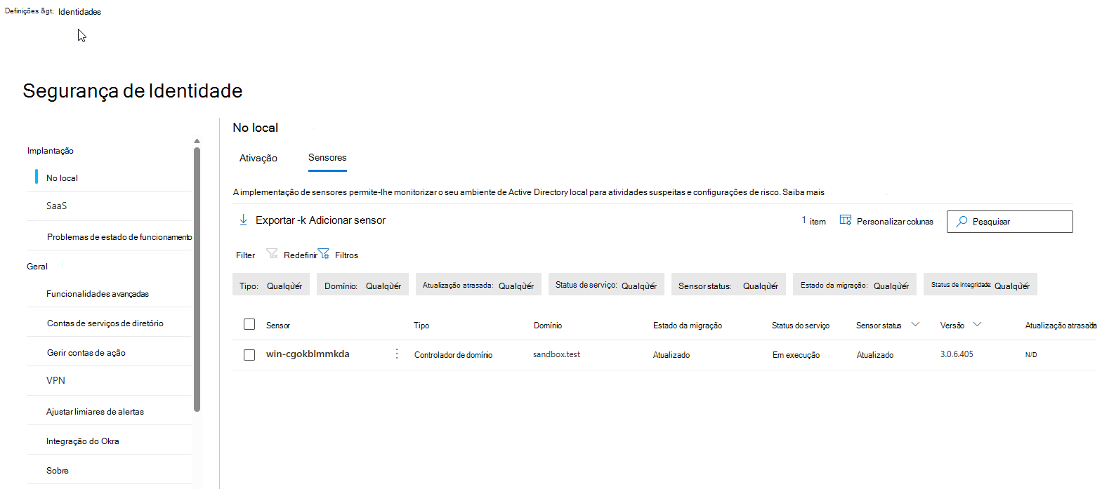 | Não Configurado | O sensor necessita de mais configuração antes de estar totalmente operacional. Isto aplica-se a sensores no AD FS, AD CS ou servidores autónomos. |