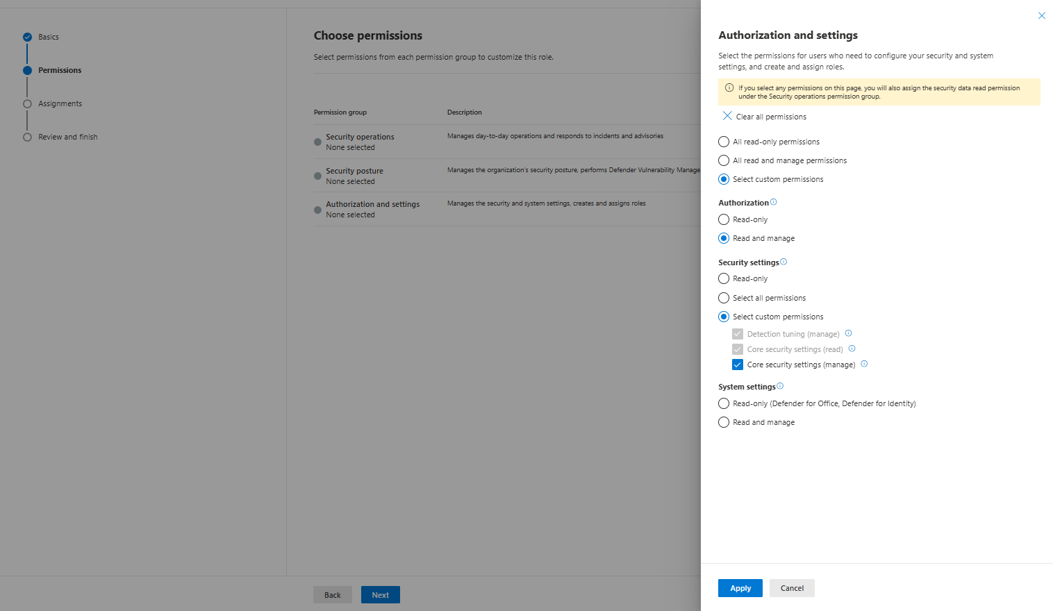 Para permissões de leitura, selecione Operações de segurança e selecione Selecionar permissões personalizadas.