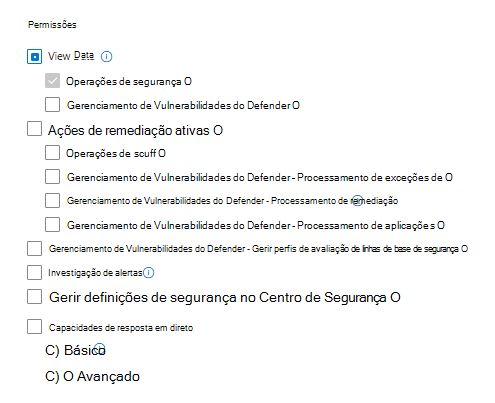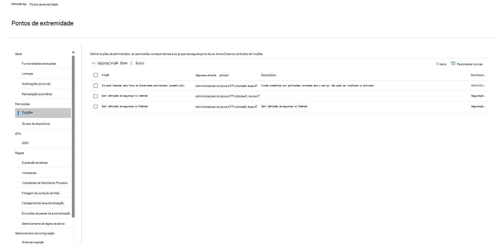 Permissões do Defender: definições de segurança principais (gerir) em Autorização e Definições e confinadas a todos os grupos de dispositivos. Entra ID funções: Administrador Global, Administrador de Segurança, Operador de Segurança e no âmbito de todos os grupos de dispositivos. |