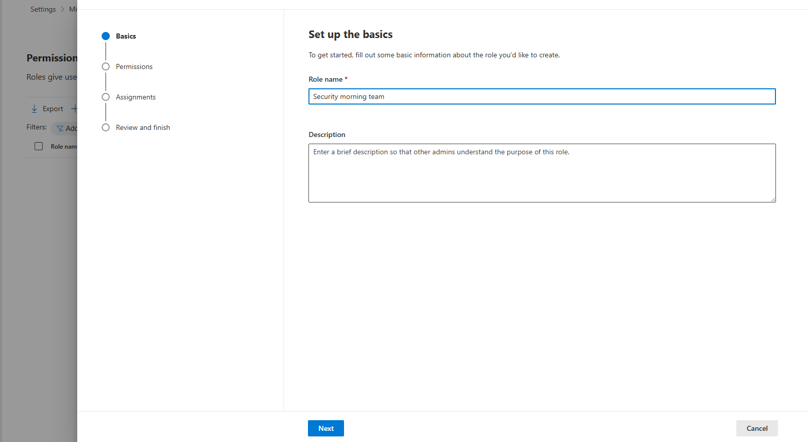 Escreva um Nome da função e, em seguida, selecione Seguinte para Permissões.