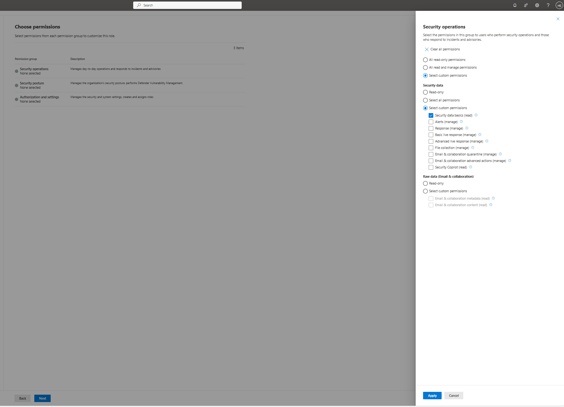 Em Dados de segurança, selecione Noções básicas de dados de segurança(leitura) e selecione Aplicar.