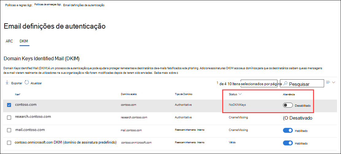 Ativado. - O valor Estado é Assinatura de assinaturas DKIM para este domínio.