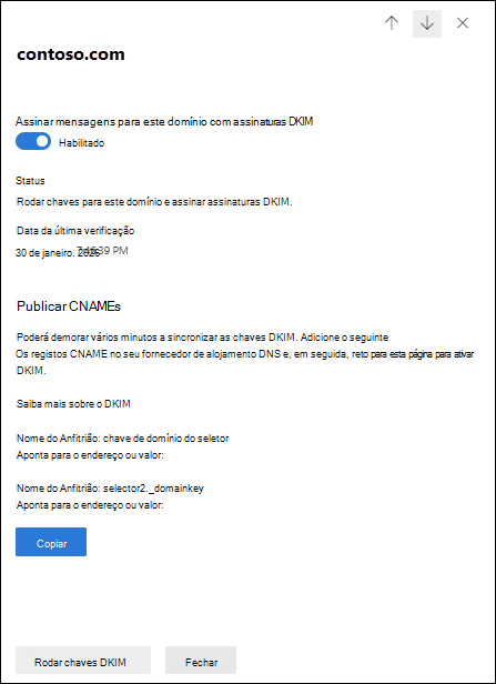 - Só pode rodar chaves DKIM em domínios com ambos os seguintes valores de propriedade no separador DKIM da página de definições de autenticação Email: