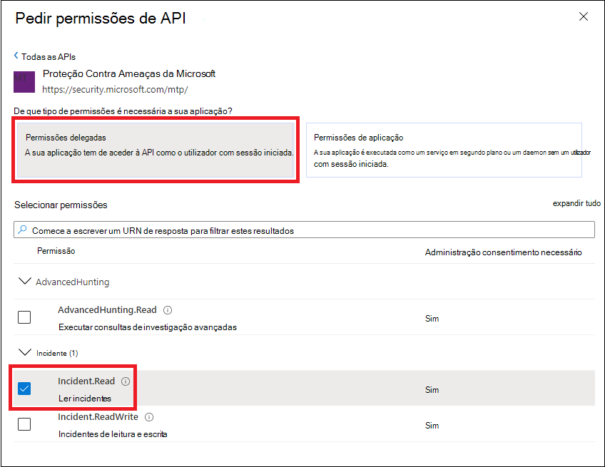 Tem de selecionar as permissões relevantes para o seu cenário. Ler todos os incidentes é apenas um exemplo. Para determinar de que permissão precisa, veja a secção Permissões na API que pretende chamar.