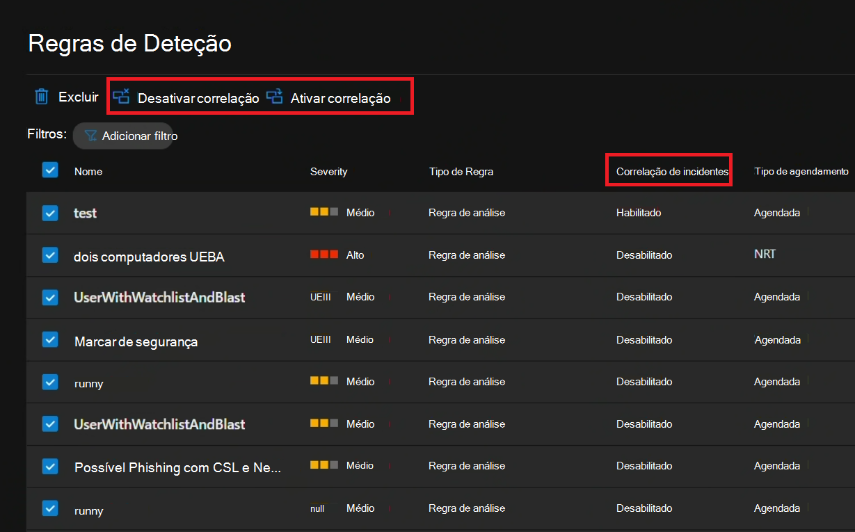Ao excluir regras de análise específicas da correlação, pode garantir que os alertas gerados por essas regras ignoram o motor de correlação e agrupam-se em incidentes exatamente como em Microsoft Sentinel — com base apenas na configuração de agrupamento da regra de análise.