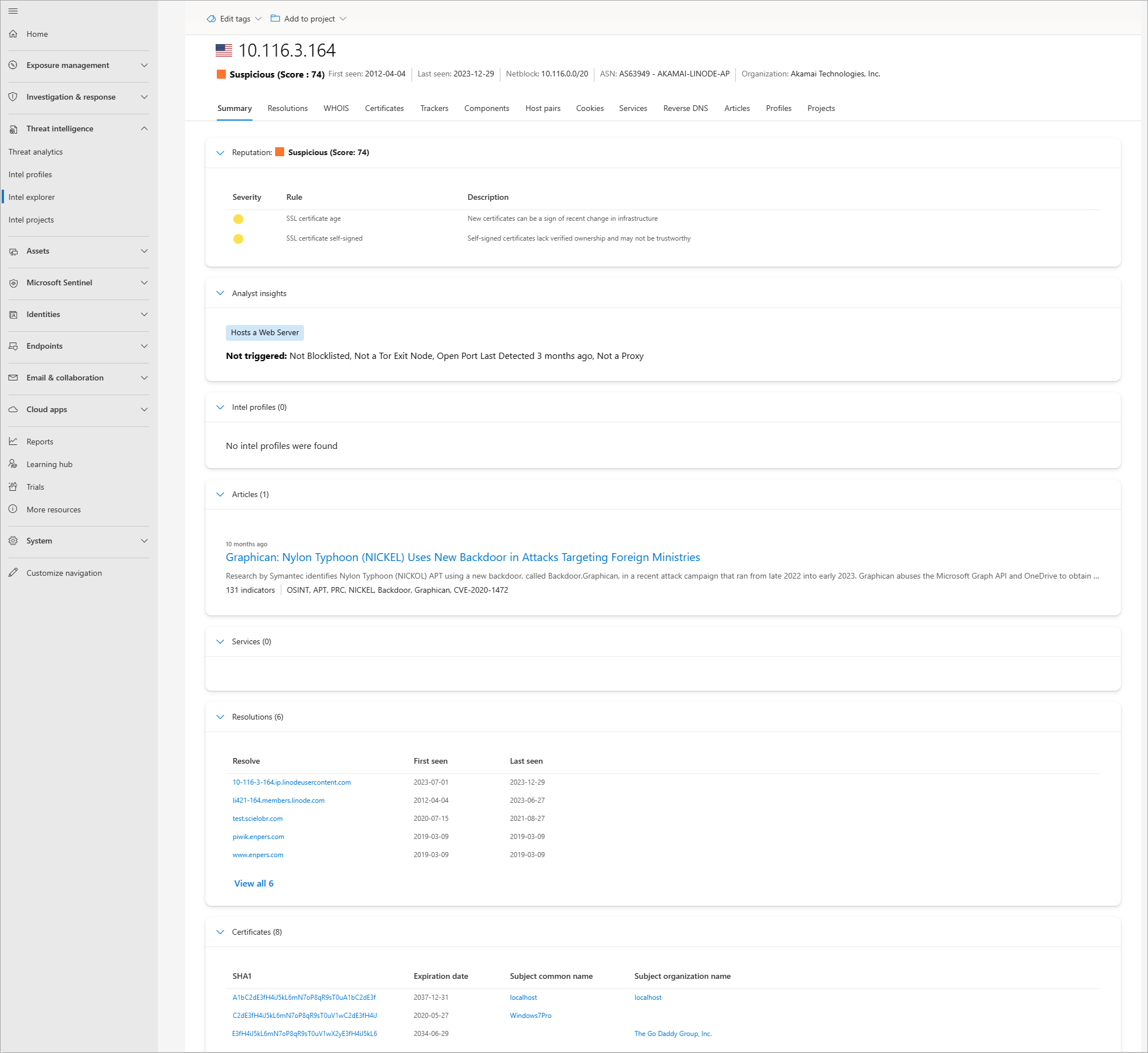 Selecione o separador Artigos relacionados do perfil e, em seguida, selecione o artigo Graphican: Nylon Typhoon (NICKEL) Uses New Backdoor in Attacks Targeting Foreign Ministeries.