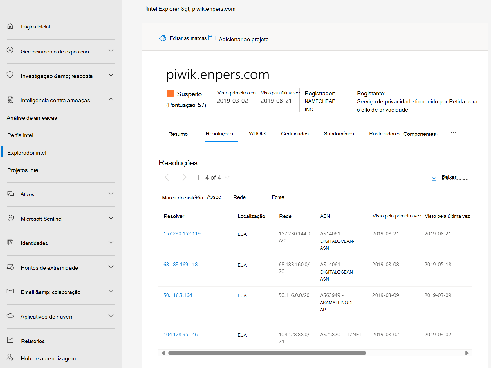 Informações sobre Ameaças do Microsoft Defender (Defender TI) será descontinuado e intercalado em Microsoft Defender para uma experiência unificada poderosa. Os clientes existentes continuarão a ter acesso total à sua experiência atual do Defender TI até que o produto seja descontinuado a 1 de agosto de 2026. Saiba Mais