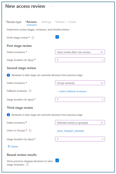 Use a caixa de diálogo Nova revisão de acesso e a guia Revisões para configurar estágios de revisão, revisores, duração e muito mais.
