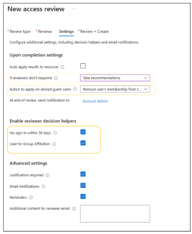 A caixa de diálogo Nova revisão de acesso e a guia Configurações , com as opções auxiliares de decisão realçadas.