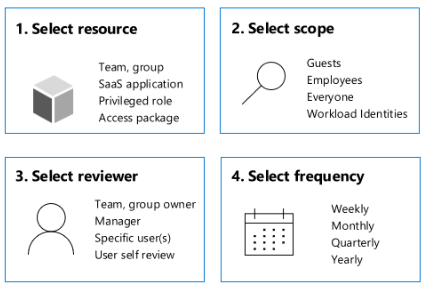 Os administradores determinam o escopo de revisão e criam revisões em revisões de acesso, aplicativos empresariais do Microsoft Entra, PIM ( Privileged Identity Management ) ou gerenciamento de direitos.