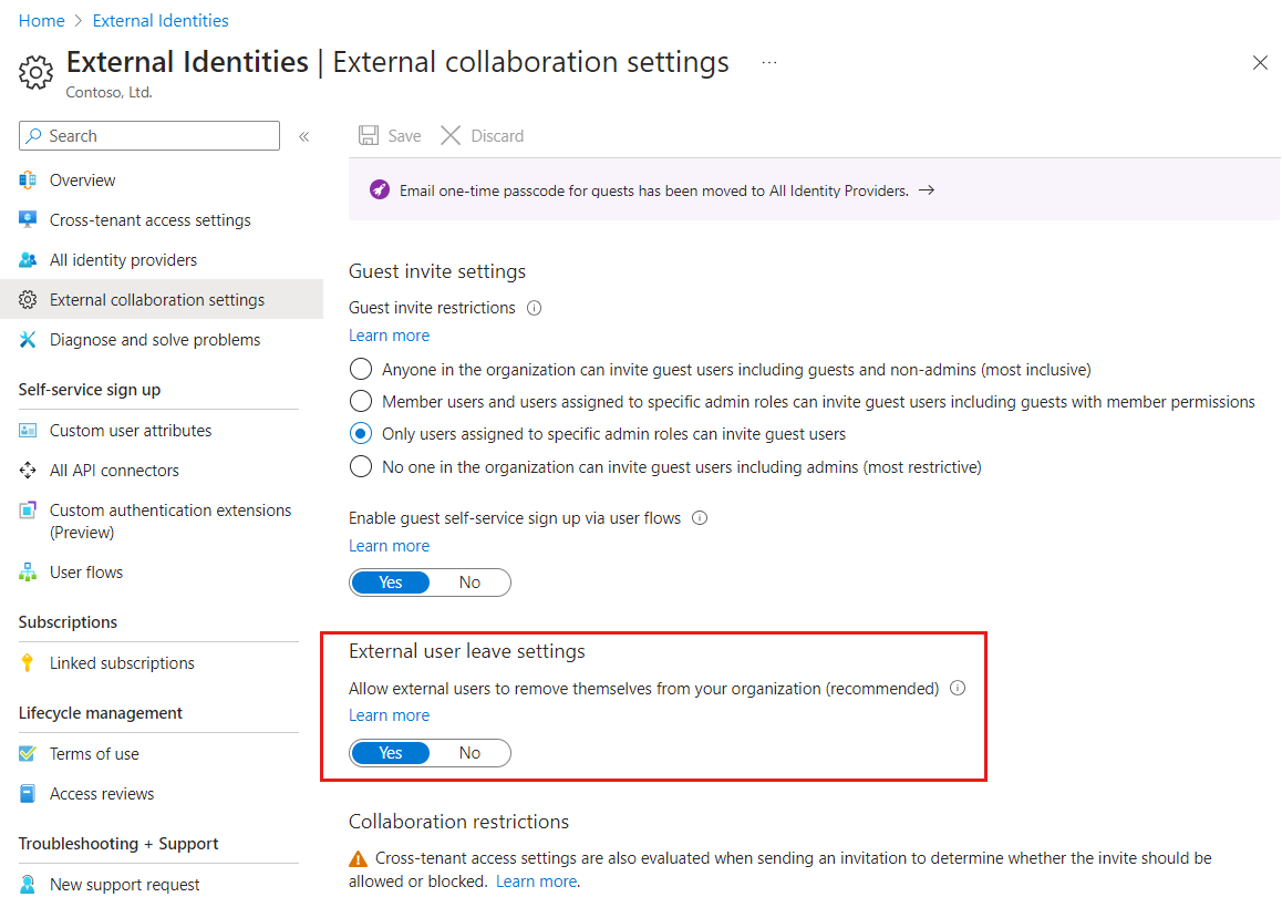 Nas configurações Saída do usuário externo, escolha se deseja permitir que os próprios usuários externos saiam da sua organização: