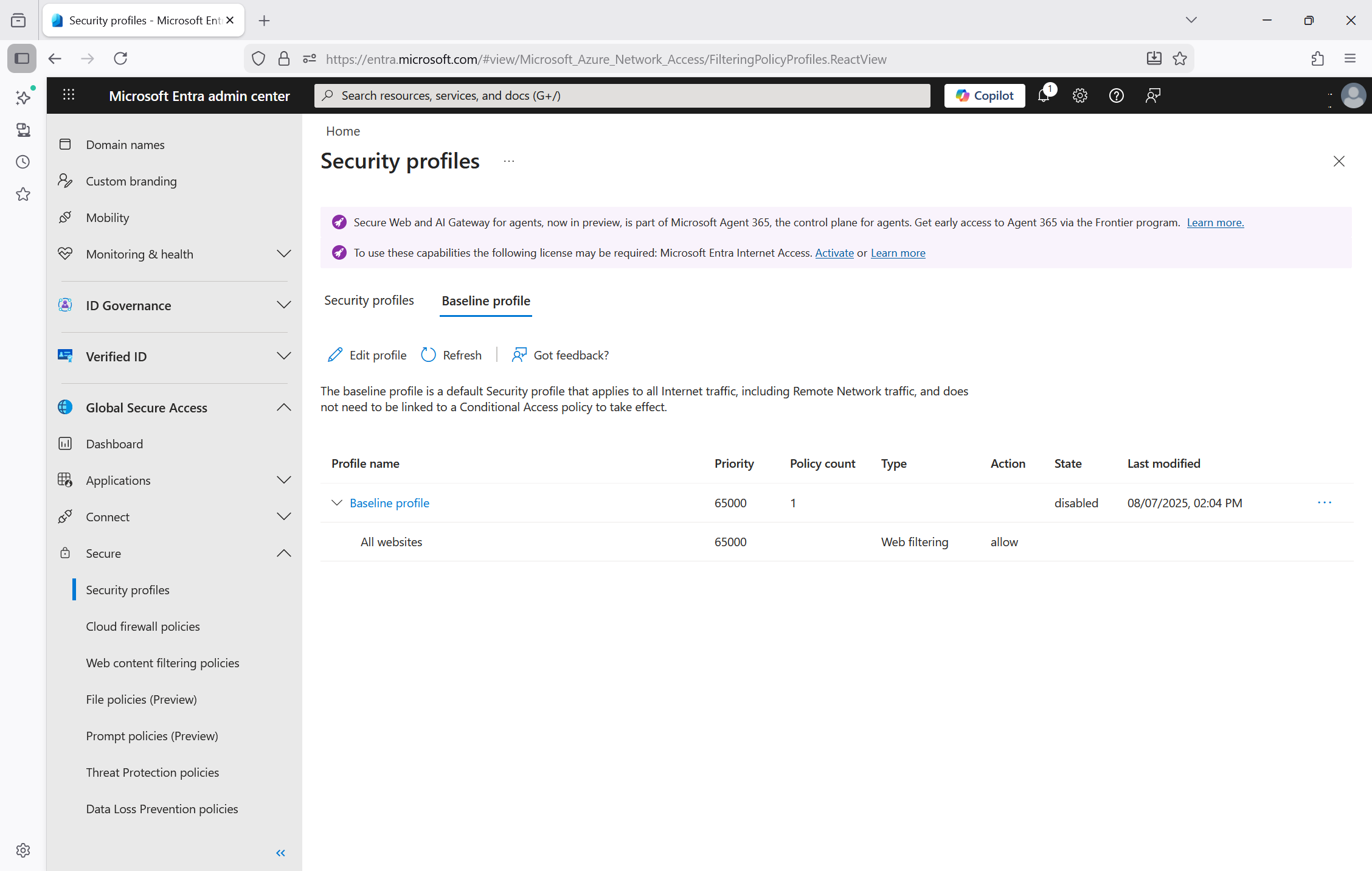 - Navegue até Global Secure Access>Secure>perfis de segurança.