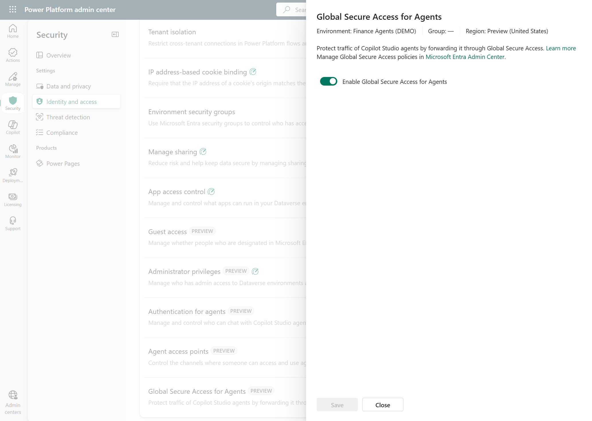 Para habilitar controles de rede para agentes do Copilot Studio, primeiro você deve habilitar o encaminhamento de tráfego desses agentes no Centro de Administração do Power Platform.