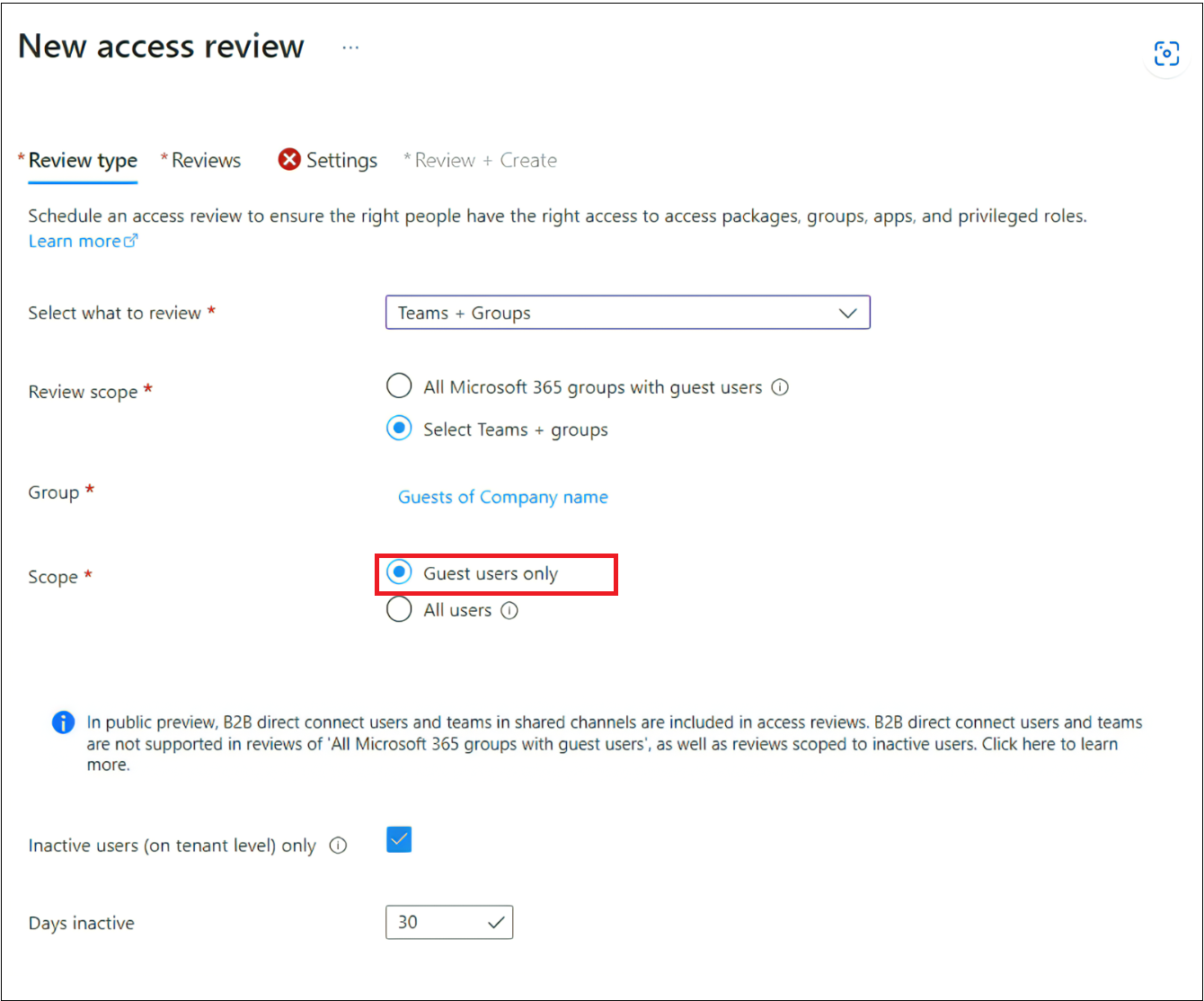 Selecione Equipes + Grupos e selecione o grupo que você anotou anteriormente que contém as identidades externas para definir o Escopo da revisão.