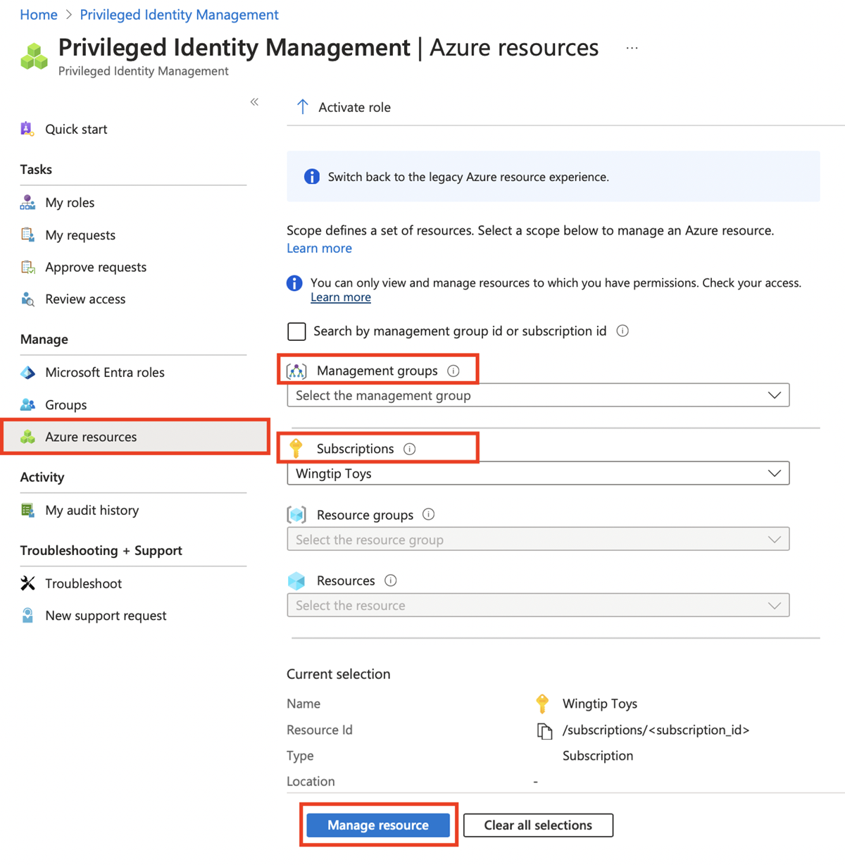 Navegue até Governança de ID>Gerenciamento de Identidade com Privilégios>Recursos do Azure. Você pode selecionar o tipo de recurso que deseja gerenciar. Comece na lista suspensa do Grupo de gerenciamento ou na lista suspensa Assinaturas e selecione Grupos de recursos ou Recursos conforme necessário.