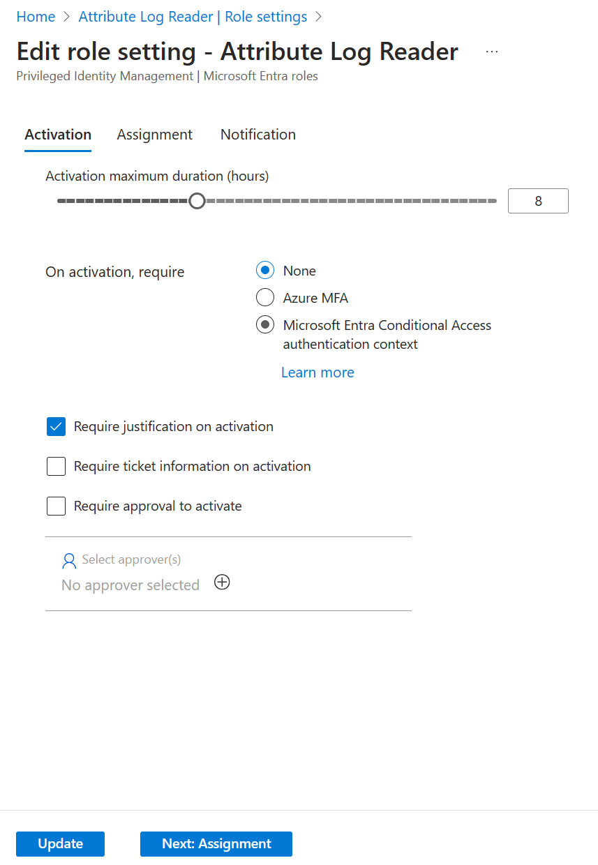 Recomendamos que você crie e habilite uma política de Acesso Condicional para o contexto de autenticação antes de definir o contexto de autenticação nas configurações do PIM. Como um mecanismo de proteção de backup, se não houver políticas de acesso condicional no locatário que direcionem o contexto da autenticação definido nas configurações do PIM, durante a ativação da função do PIM, o recurso de autenticação multifator no Microsoft Entra ID é necessário, pois a configuração Na ativação, exigir a autenticação multifator seria definida.