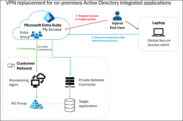 As organizações geralmente enfrentam desafios para habilitar o acesso seguro a aplicativos integrados ao AD para usuários híbridos, aqueles cujas identidades existem tanto na nuvem quanto no local. Utilizando o Acesso Privado do Entra, o gerenciamento de direitos e a reescrita de grupos, as organizações podem implementar o acesso controlado para usuários híbridos em aplicativos on-premises integrados ao AD.