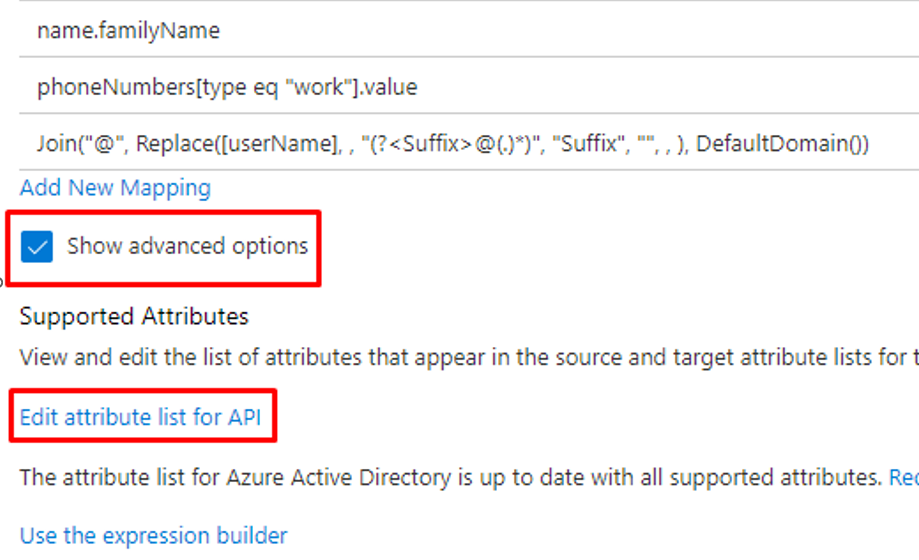 - Role a página Mapeamentos de Atributos para baixo. Selecione Mostrar opções avançadas e clique no link Editar lista de atributos para a API.