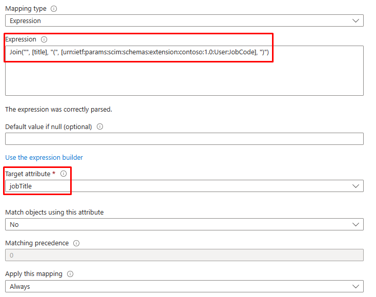 urn:ietf:params:scim:schemas:extension:contoso:1.0:User:JobCodecomo parte dojobTitleatributo do Microsoft Entra.Join("", [title], "(", [urn:ietf:params:scim:schemas:extension:contoso:1.0:User:JobCode], ")")Com esse mapeamento de expressão, se