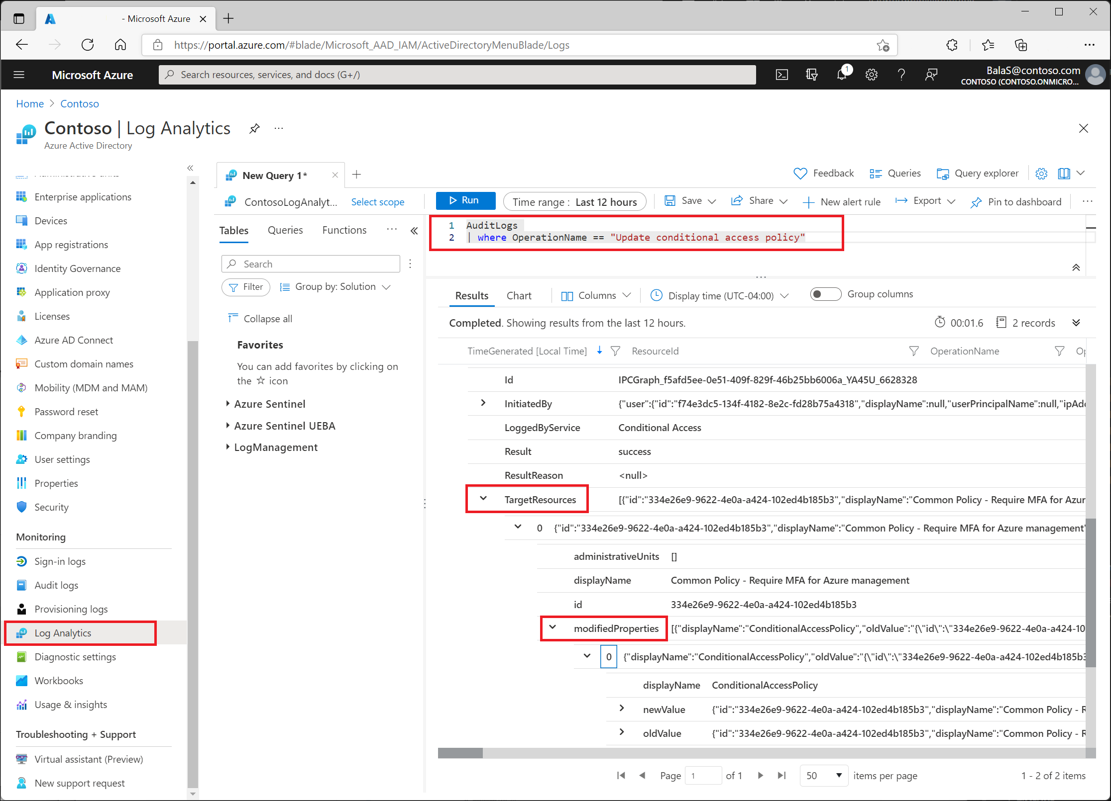 Depois de habilitá-lo, localize o Log Analytics noMonitoramento deID> de Entra &Log Analytics de integridade>. A tabela mais relevante para os administradores de Acesso Condicional é AuditLogs.