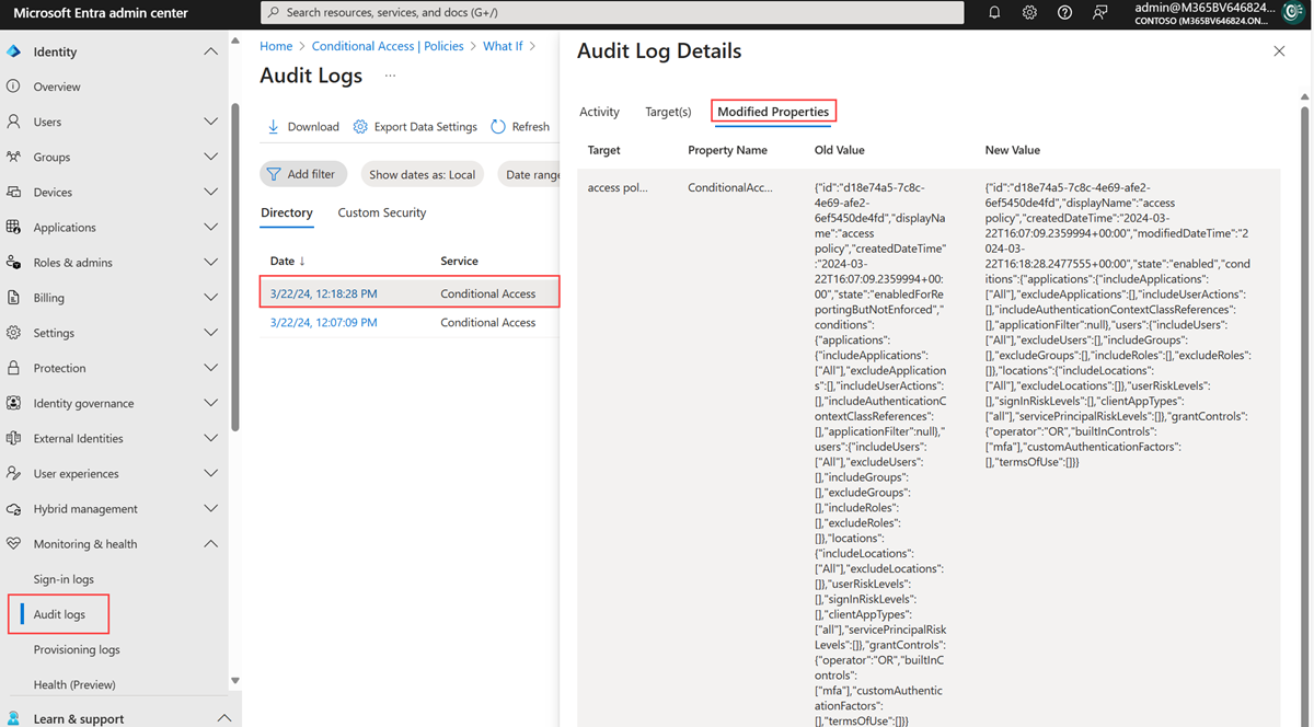 O log de auditoria do Microsoft Entra é uma fonte valiosa de informações ao solucionar problemas sobre o por que e como as alterações na política de Acesso Condicional aconteceram no seu ambiente.