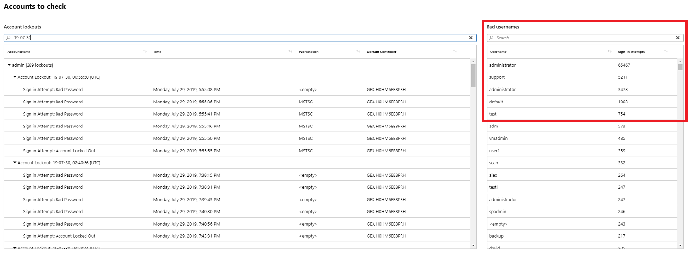 A área abaixo do gráfico mostra eventos de entrada individuais, juntamente com informações como o resultado da atividade e a estação de trabalho de origem. Essas informações podem ajudar a determinar fontes repetidas de eventos de entrada que podem causar bloqueios de conta ou indicar um possível ataque.