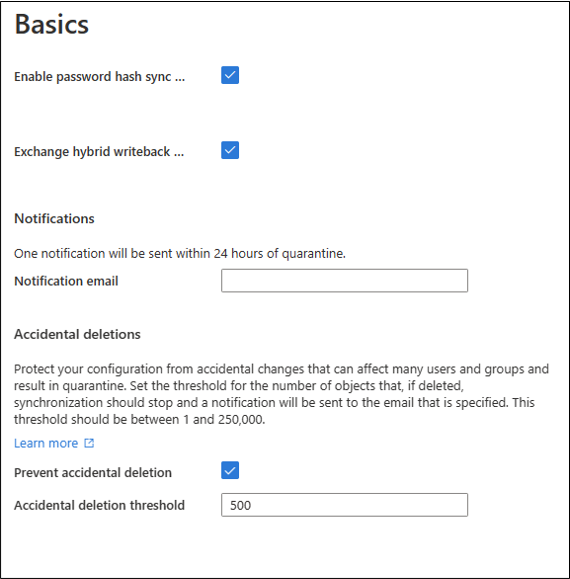 Se a caixa de seleção Exchange hybrid writeback estiver desabilitada, isso significa que o esquema não foi detectado. Verifique se os pré-requisitos foram atendidos e se você reiniciou o agente de provisionamento.