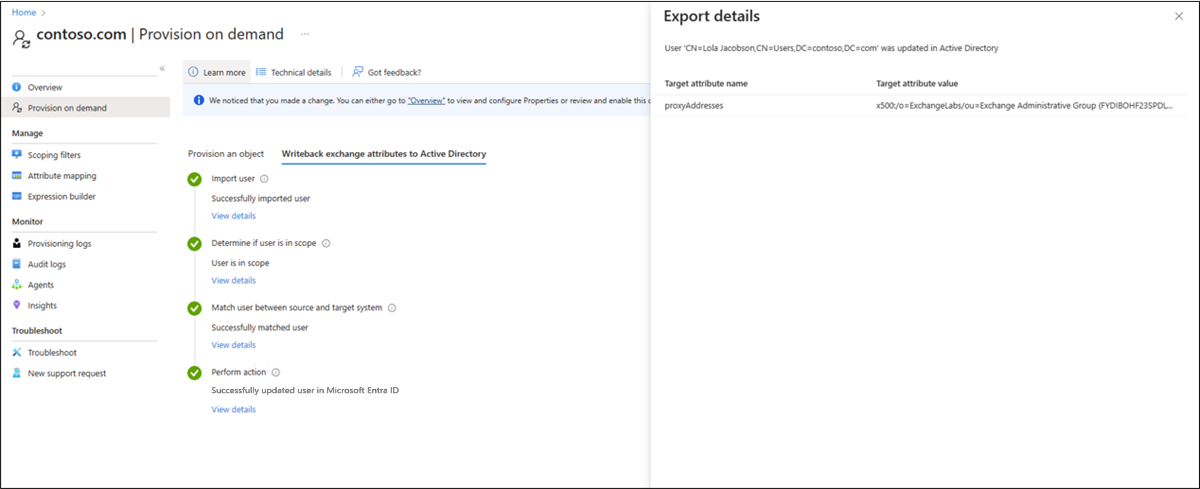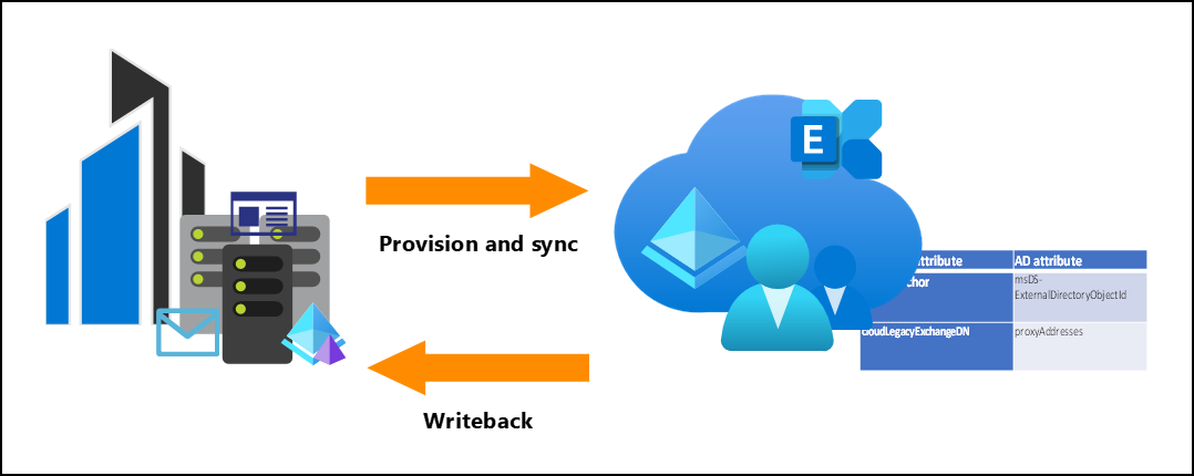 O provisionamento sob demanda com write-back híbrido do Exchange requer duas etapas. Você precisa primeiro provisionar ou criar o usuário. O Exchange online preenche os atributos necessários no usuário. Em seguida, a sincronização de nuvem pode "gravar de volta" esses atributos para o usuário. As etapas são: