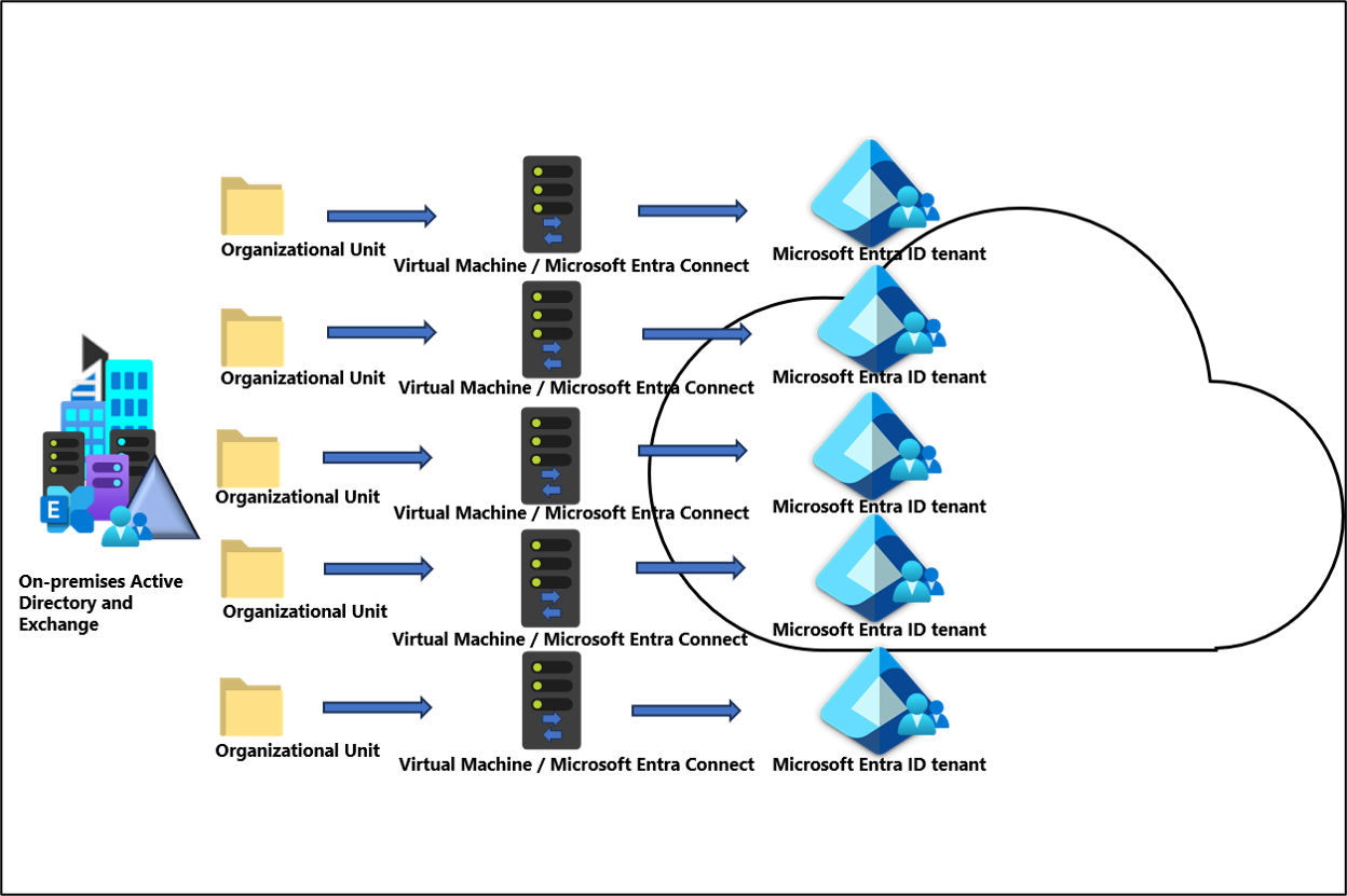 - Cada Microsoft Entra Connect Server tem suas regras de sincronização com escopo para UOs individuais.