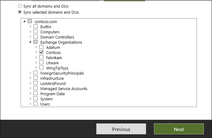 Configure o escopo para a Unidade Organizacional local que corresponde ao locatário com o qual você está sincronizando o Microsoft Entra Connect.