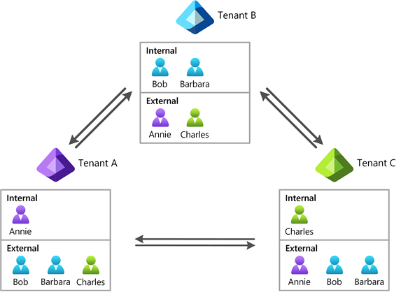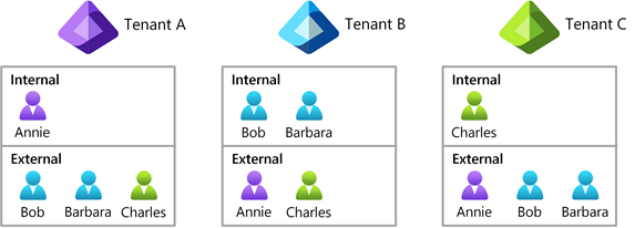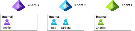 Por exemplo, digamos que Annie no locatário A, Bob e Barbara no locatário B, e Charlie no locatário C querem colaborar. Conceitualmente, esses quatro usuários representam um conjunto de usuários colaboradores de quatro identidades internas em três locatários.