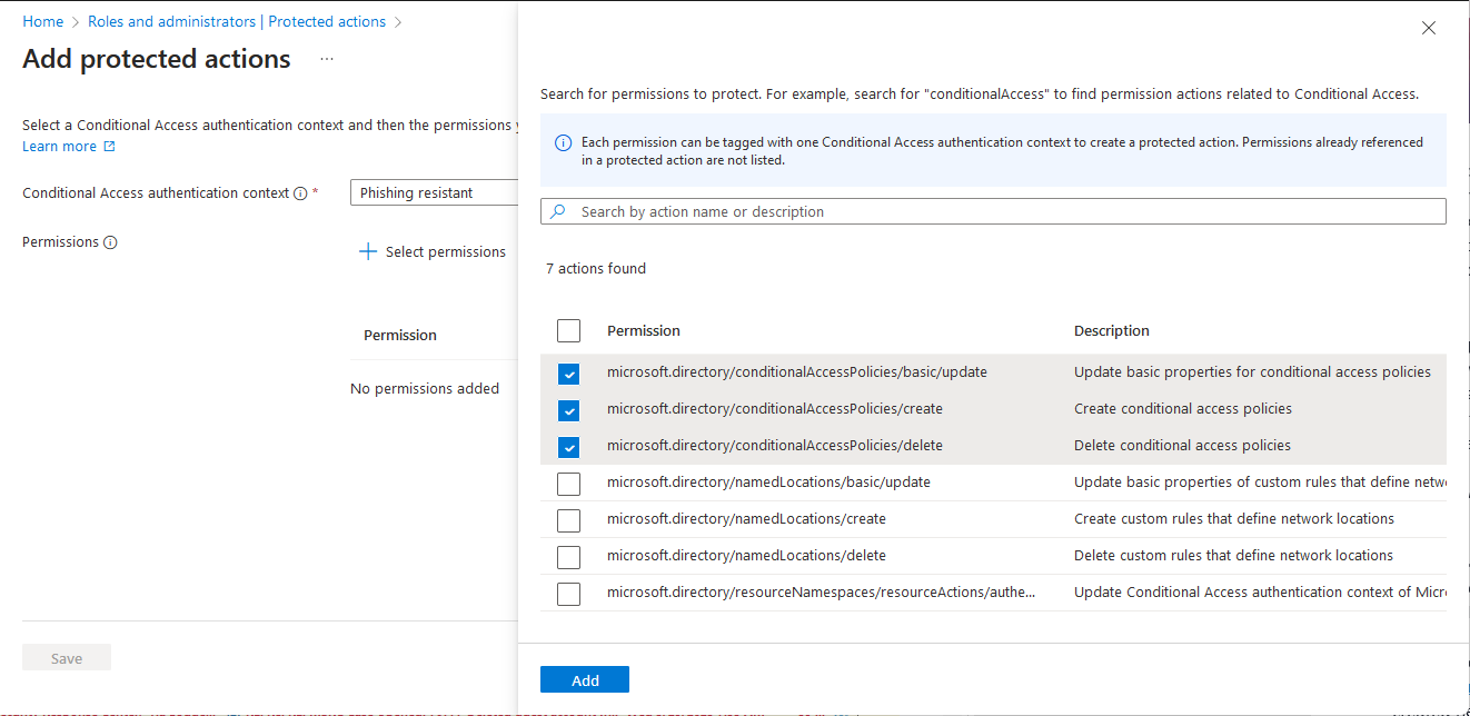 Entra ID Funções & administradores Ações protegidas .Selecione Adicionar ações protegidas para adicionar uma nova ação protegida.